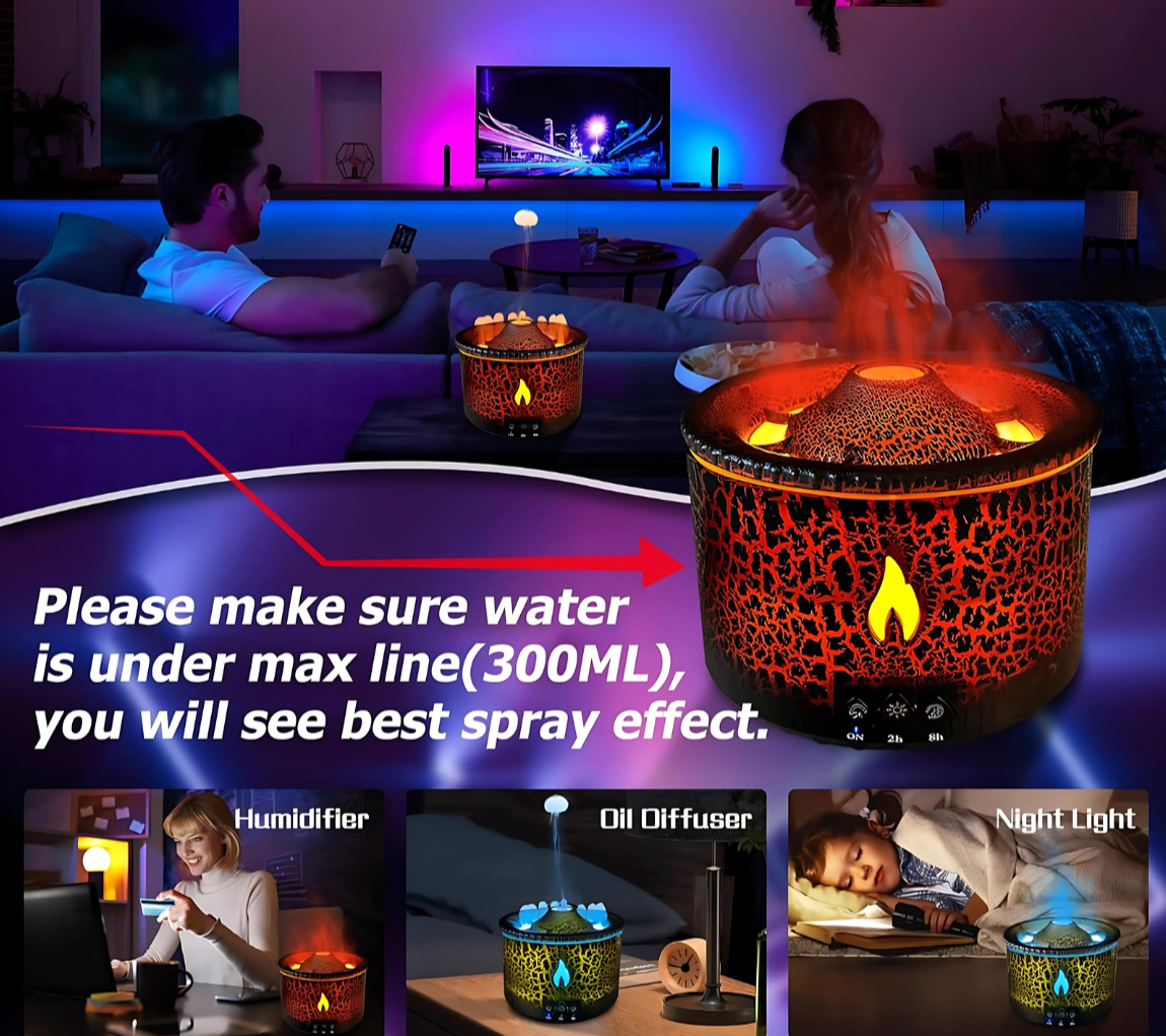 The combination of LED lights and misting effects simulates the look of flames burning and volcanic eruptions, creating a realistic visual experience.